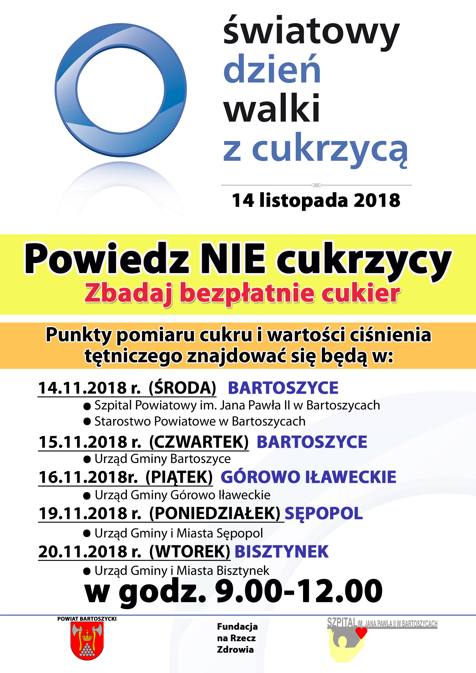 Wersja obowiązująca z dnia 08-11-2018 12:04:43 Drukuj Powiedz NIE cukrzycy ! Zapraszamy na bezpłatny pomiar cukru i wartości ciśnienia tętniczego. Załączniki Ogłoszenie format: image/jpeg, rozmiar: 756.96 KB, data dodania: 08-11-2018 12:04:43