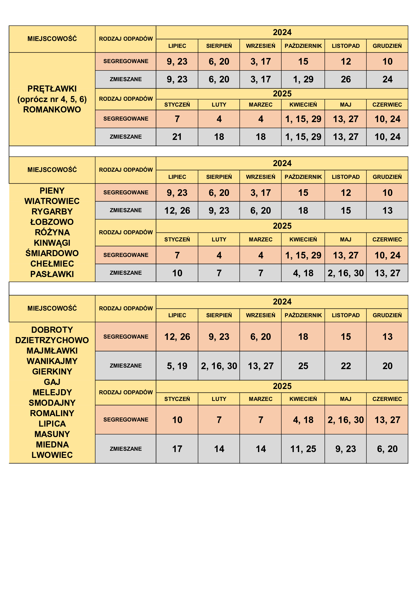 Harmonogram odbioru odpadów komunalnych obowiązujący w okresie od 01 lipca 2024 r. do 30 czerwca 2025 r.