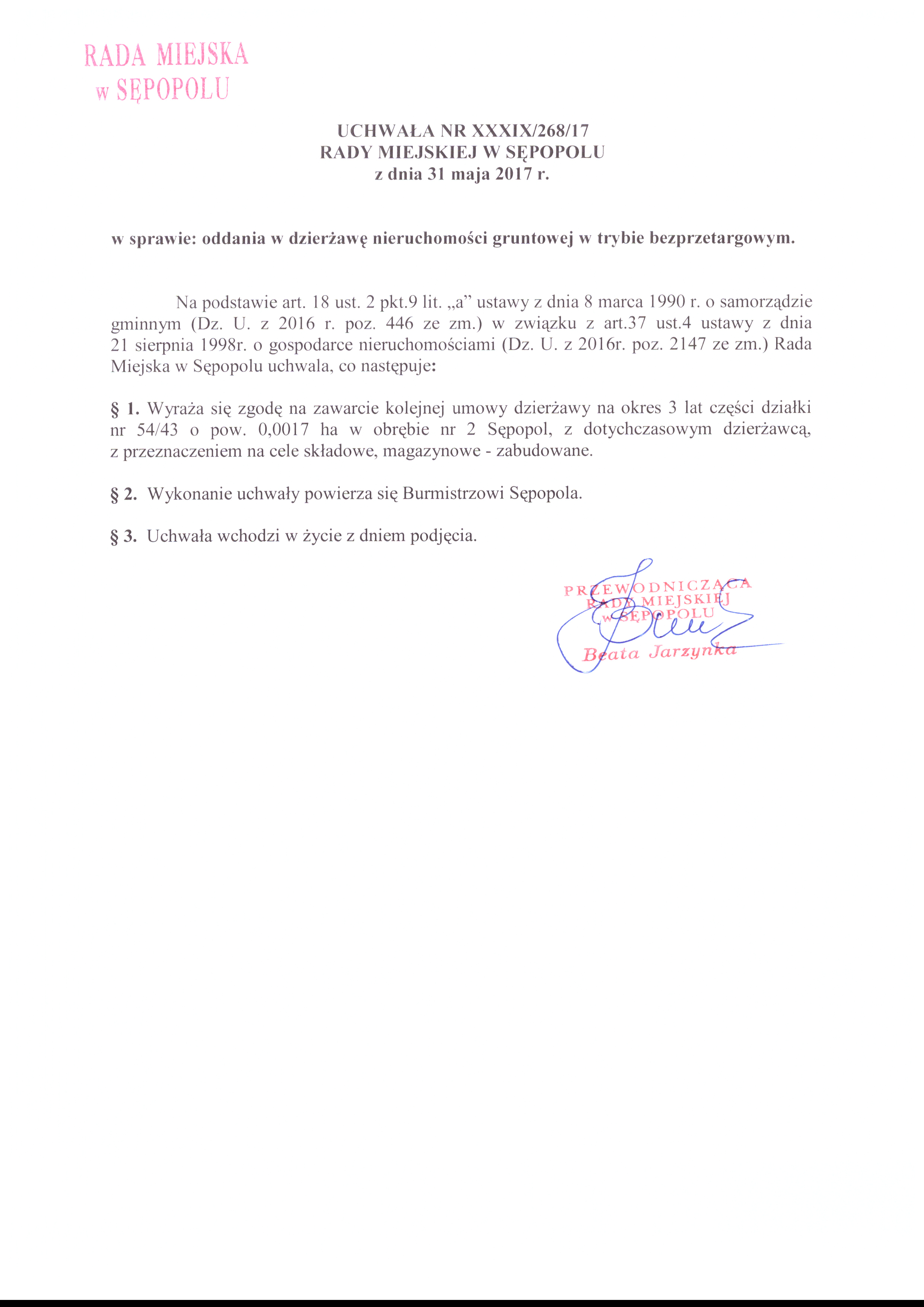 w sprawie oddania w dzierżawę nieruchomości gruntowej w trybie bezprzetargowym.