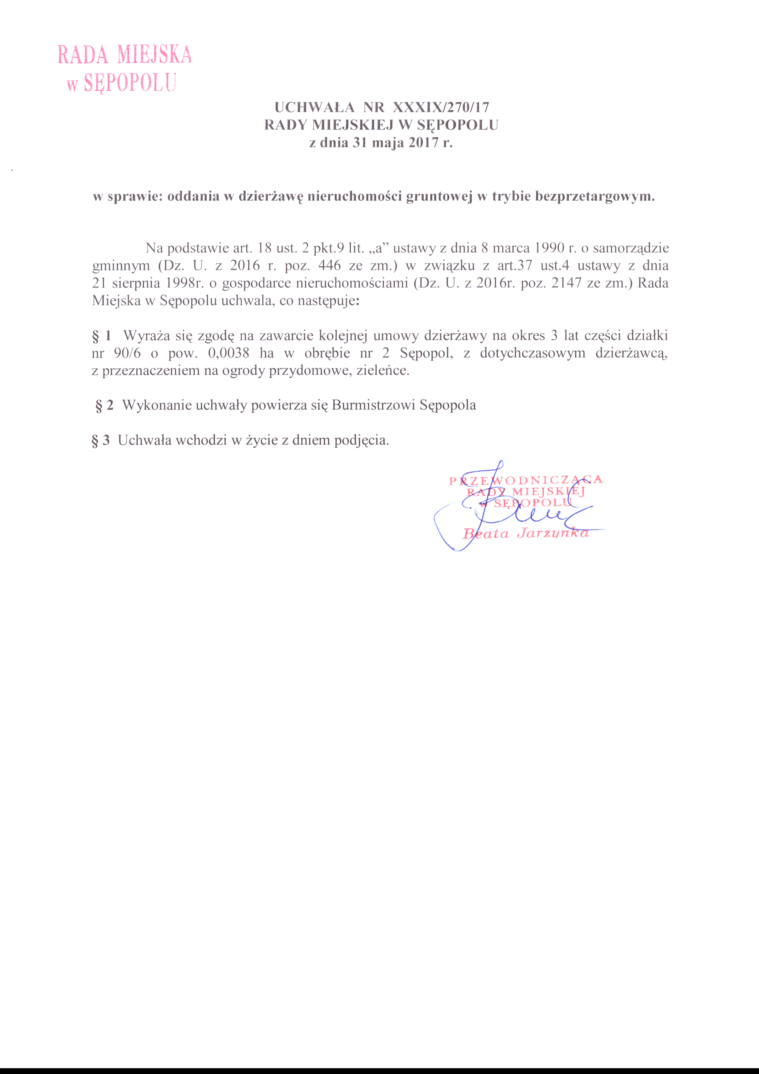 w sprawie oddania w dzierżawę nieruchomości gruntowej w trybie bezprzetargowym.