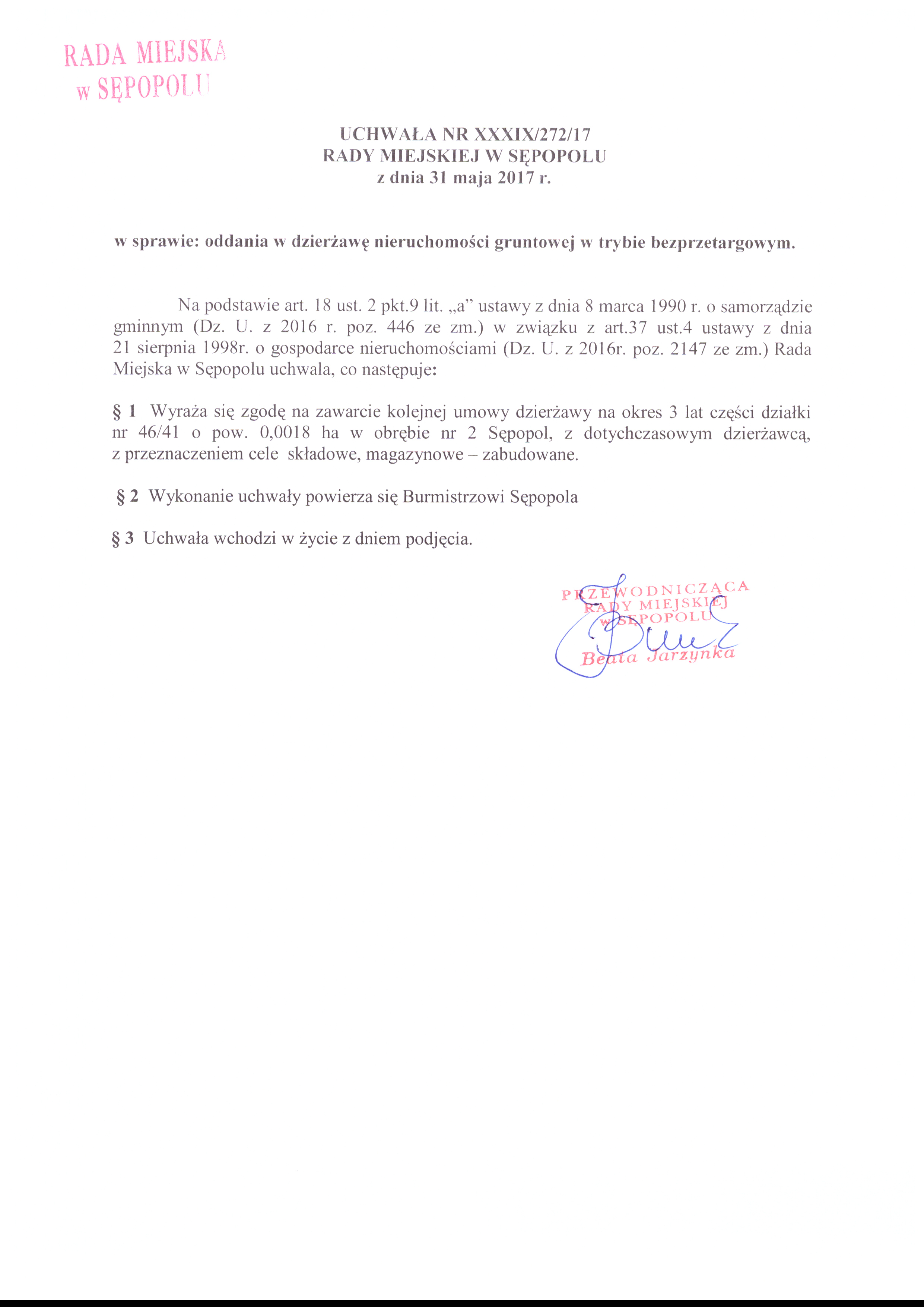 w sprawie oddania w dzierżawę nieruchomości gruntowej w trybie bezprzetargowym.