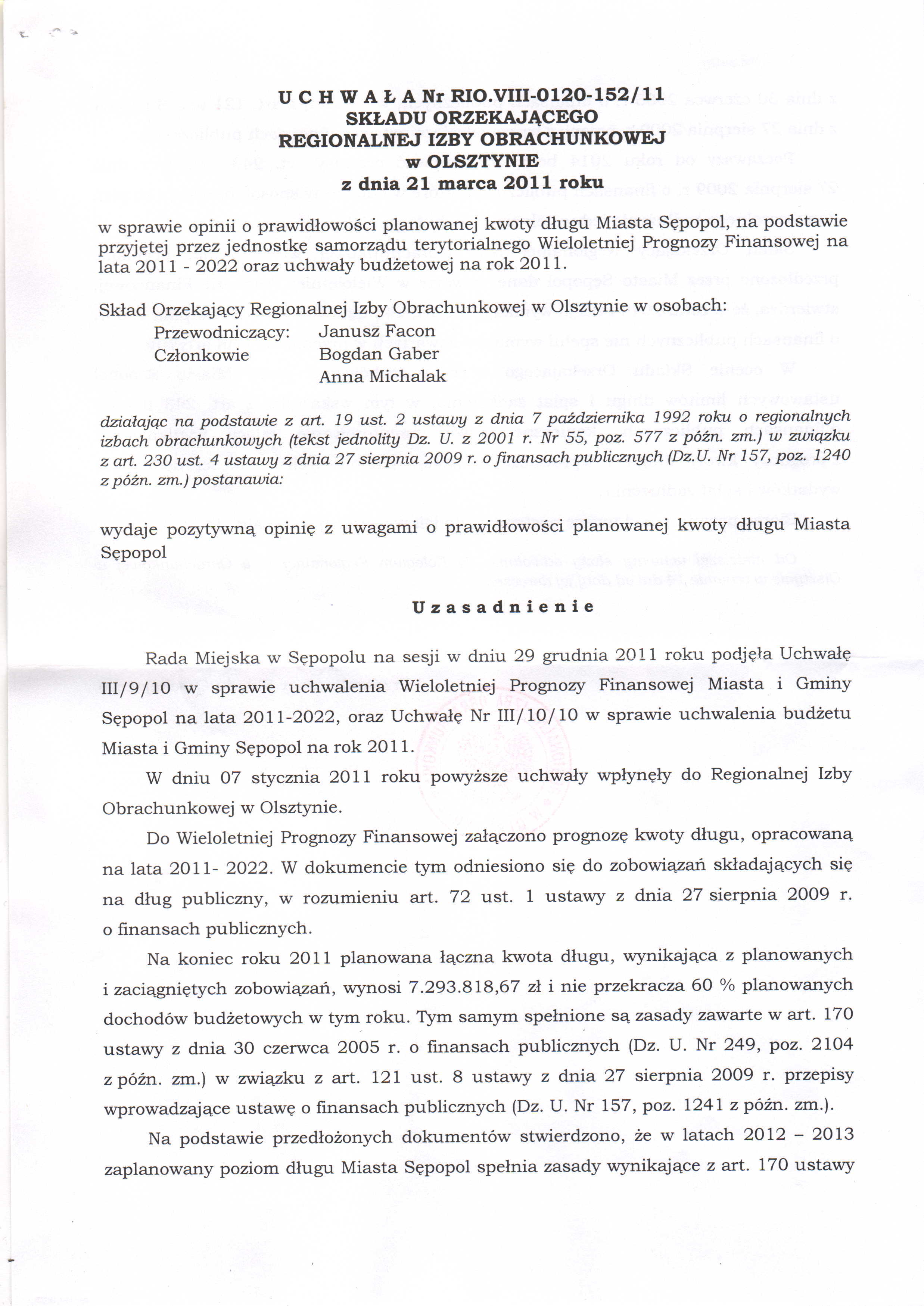 Uchwalić Wieloletnią Prognozę Finansową Miasta i Gminy Sępopol na lata 2011–2022, zgodnie z Załącznikiem Nr 1 do Uchwały.